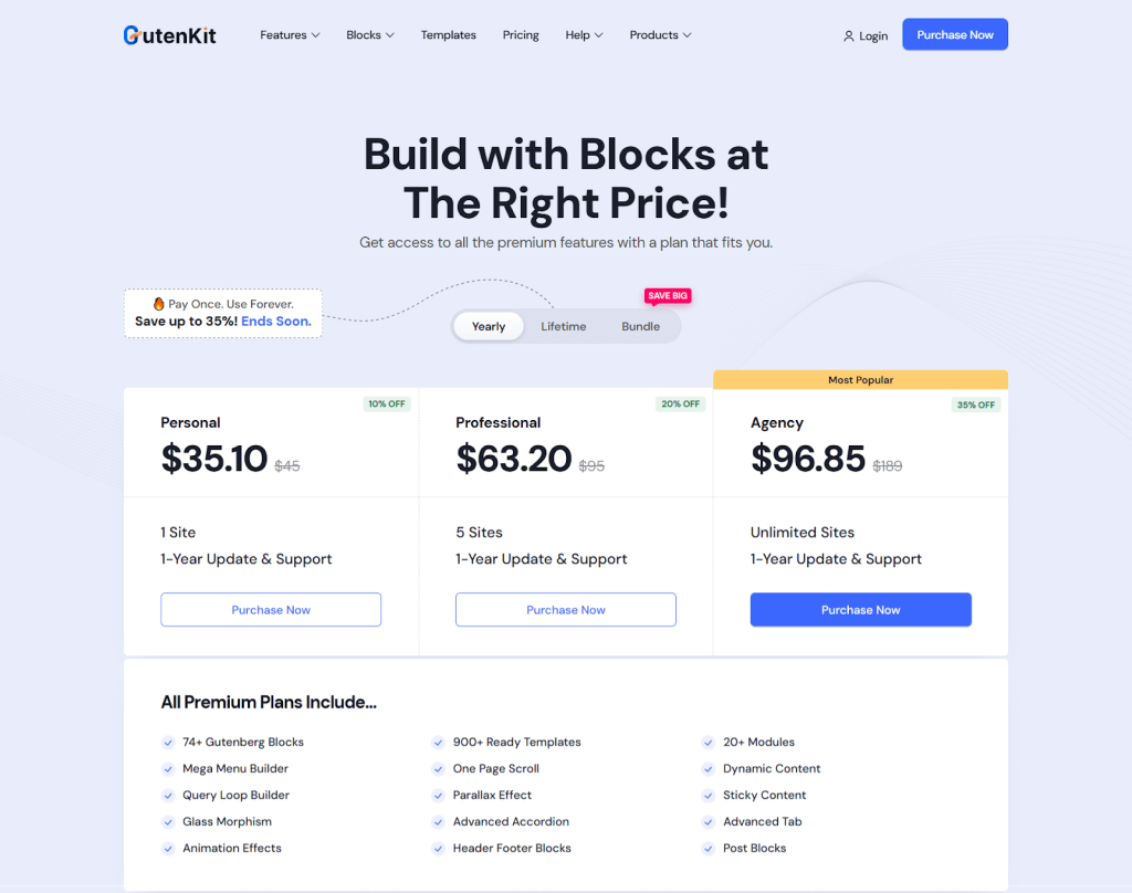 You get a powerful free version with essential blocks, and a Pro upgrade that offers advanced design options, premium patterns, and exclusive templates, all for a fair price.
