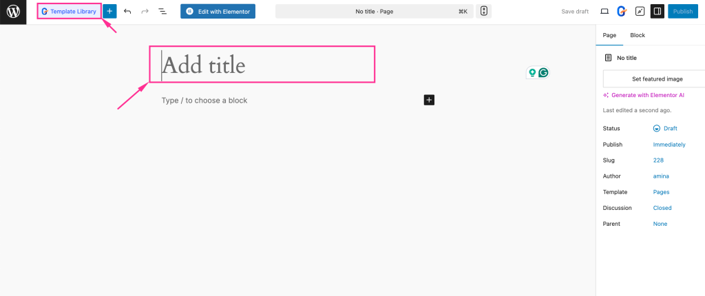 In the fourth step, you have to import a suitable Gutenberg block template for eCommerce site. For that, add a name to your page and press the “Template Library” button on the top left side.