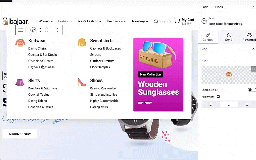 The mega menu of GutenKit allows visitors to easy navigation. You can set it as vertical or horizontal and design it with images and media. You also have option to select pre-designed template so you’ll need a little customization. You can enhance your mega menu with animation effects.